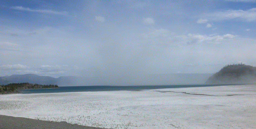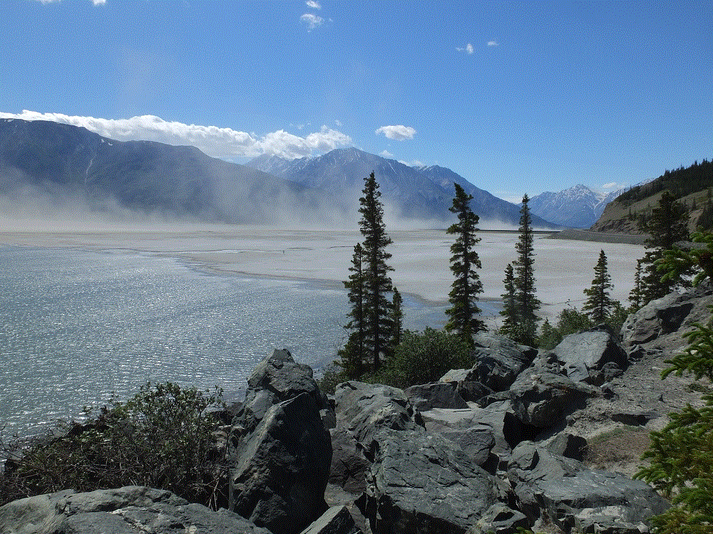 At one point, we noticed the distant mountains were shrouded by haze. We assumed a forest fire, but discovered the haze was an immense dust cloud raised by winds blowing along a dried portion of Kluane Lake.