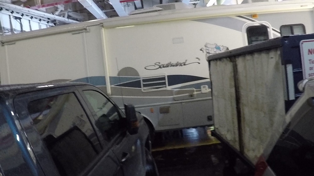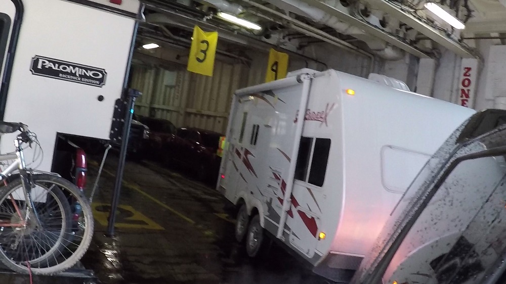 To our surprise we had to back our truck and camper down the ramp onto the ferry and then make a 90 degree turn. Some people seem to have an amazing talent backing a trailer – NOT ME!
