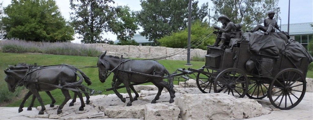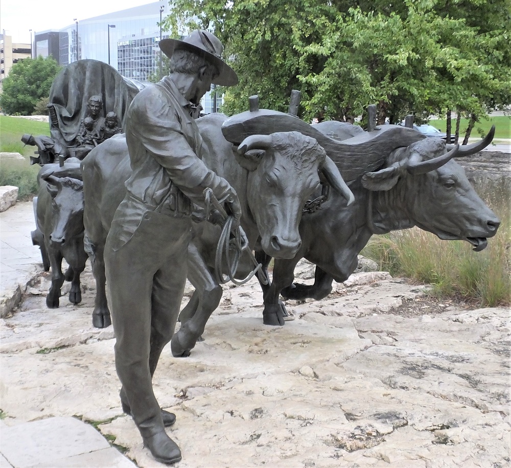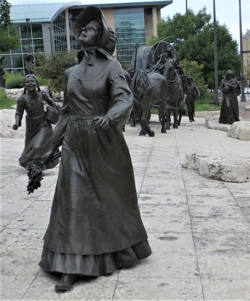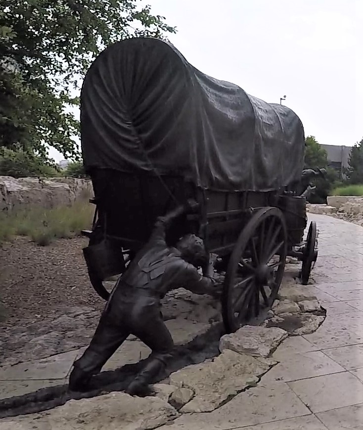 We stopped at Pioneer Courage Park. The park has numerous bronze and stainless steel sculptures dedicated to the pioneers. Our visit was cut short when it started to rain and there were several too-close-for-comfort lightning flashes. We QUICKLY (!) returned to our truck.