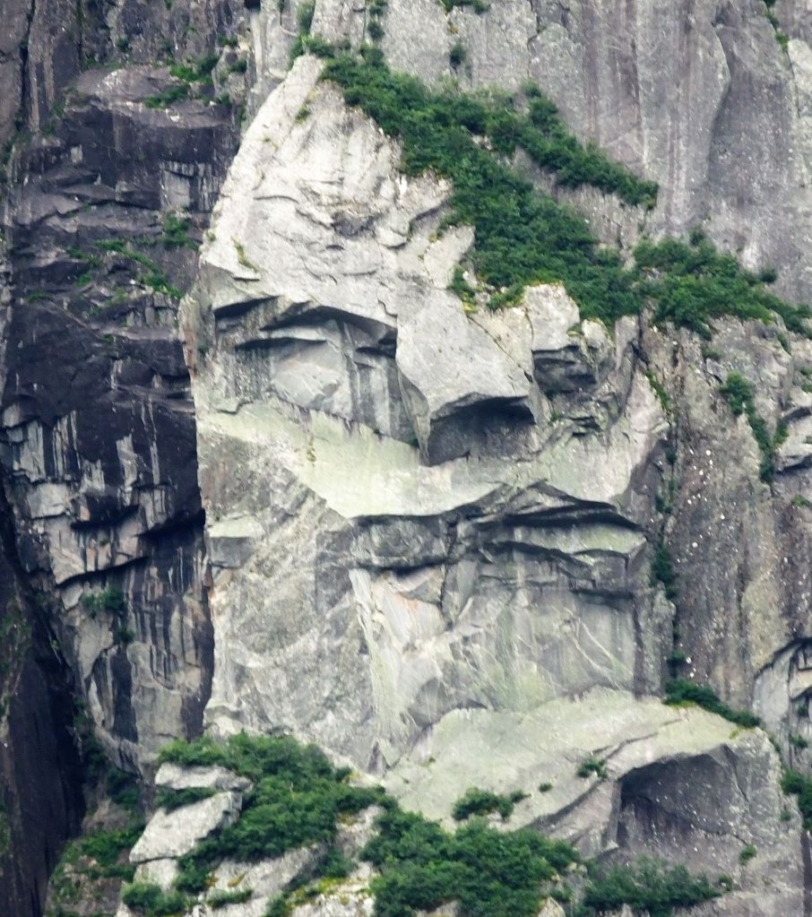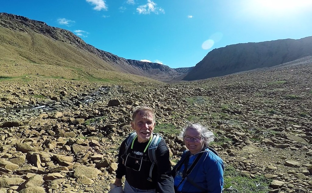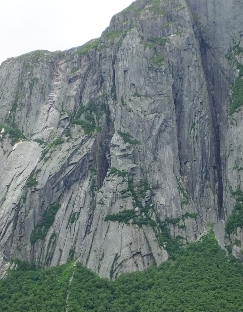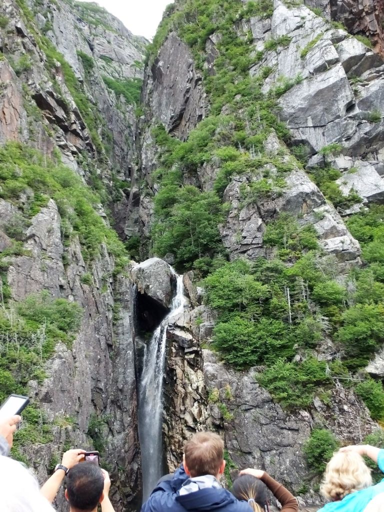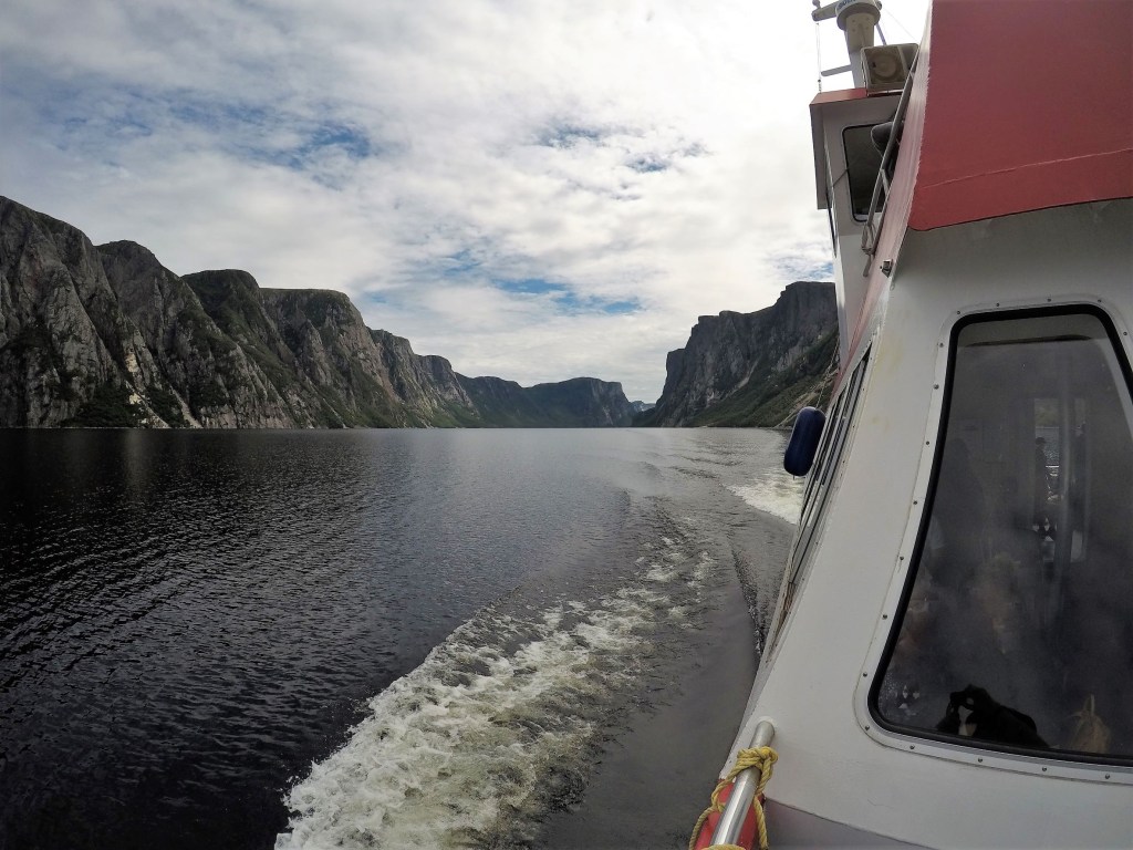 While at Cow Head, we enjoyed one of ‘top 10’ things to do while on NF – the Western Brook Boat Tour. After a 1.8 mile hike from the parking lot, our morning boat ride started on the mirror smooth pond just west of the Long Range Mountains. The trip took us nearly ten miles into a narrow freshwater fjord with two thousand foot cliffs on either side. We learned the pond has a maximum depth of 541 ft and is ultraoligotrophic, low in nutrients so it supports a few slow growing plants and animals.
