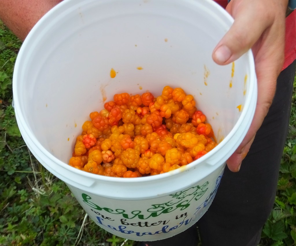 A bit further, we met Jennifer, a Labrador native, who showed us her half-full bucket of yellow-orange bakeapple berries. Getting enough berries to make jam is a lot of work considering each bakeapple plant produces only one raspberry-sized berry.