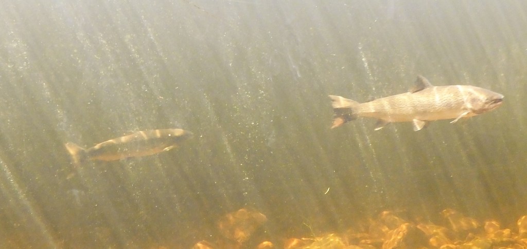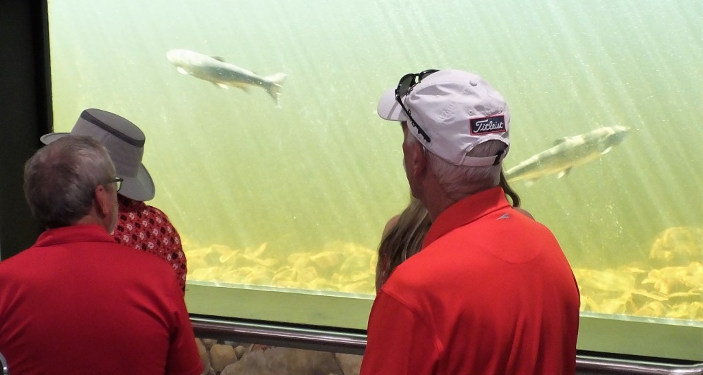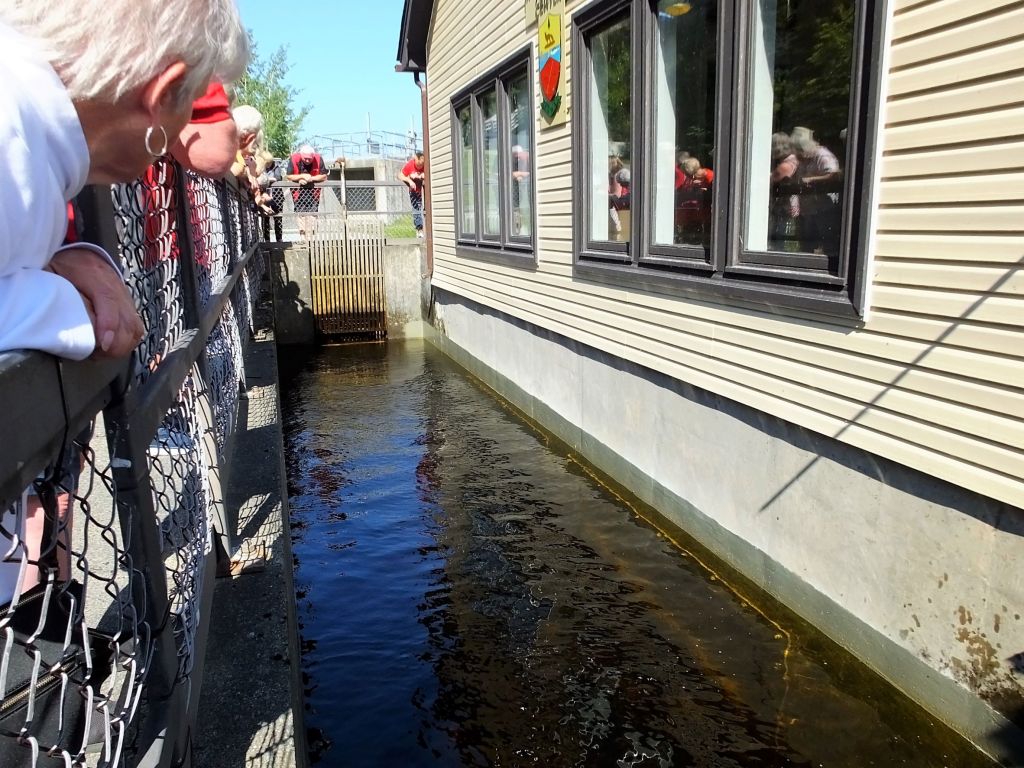 The center monitors the fish as they come and go from the upper river in an underground viewing room. The salmon population is thriving.