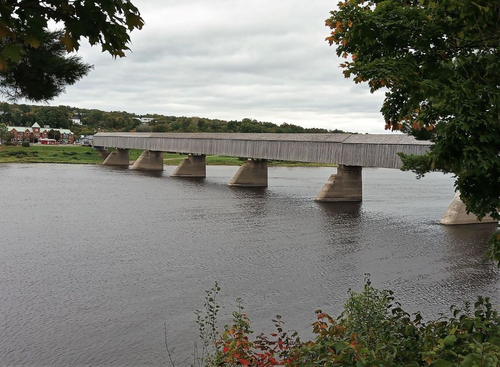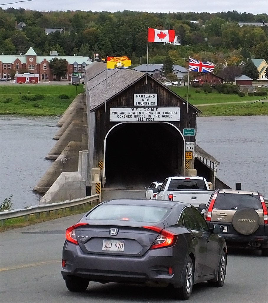 We stopped to see the world’s longest covered bridge in Hartland, NB as we traveled. We drove down a steep road that led to the 1282-foot-long single lane bridge where it crossed the St John River. As we neared the bridge, we realized the bridge had a height limit of 10 feet. We had to do some quick rerouting – Oscar is 11 feet 6 inches tall!
