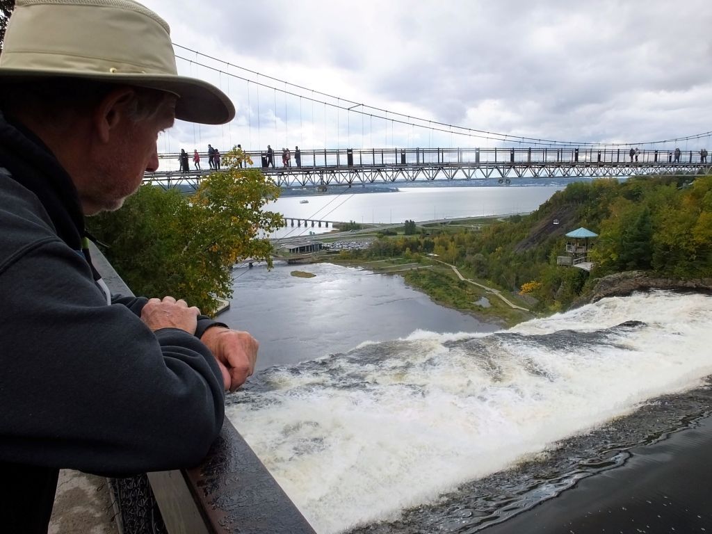 Our falls visit was damp, alternating between light rain and mist from the falls. We viewed the top of falls from a suspension bridge – only few yards away from the brink of the falls. Far below, the flow from the falls extended to the St. Lawrence River.