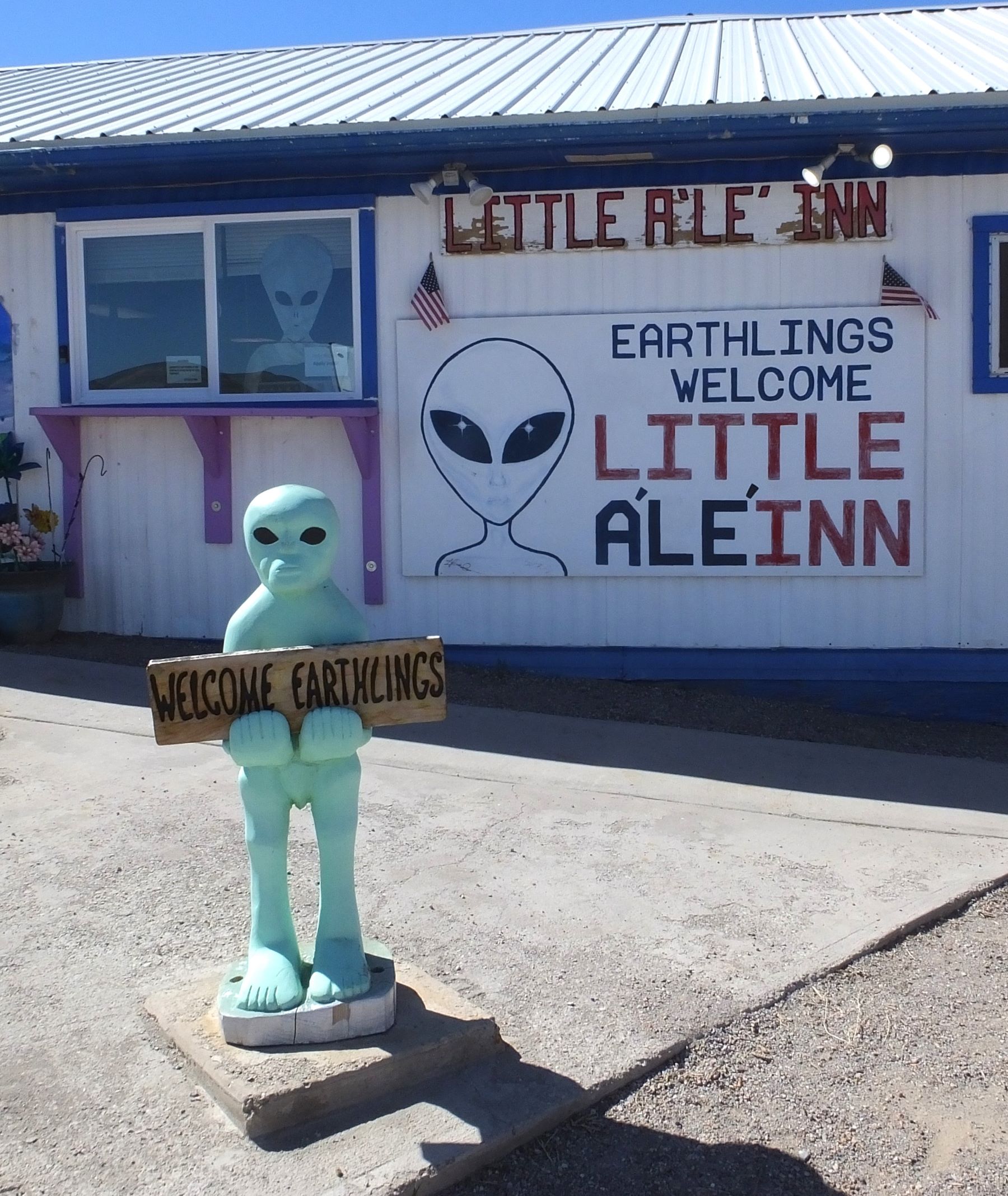 We came upon a truck with a flying saucer in tow and several chartreuse green aliens nearby. A sign assured us that earthlings are welcome at the A’Le’Inn, a restaurant, bar, motel and RV park in the small, remote town of Rachel, NV. This was not an alien outpost, but rather a kitschy tourist trap in the middle of nowhere.