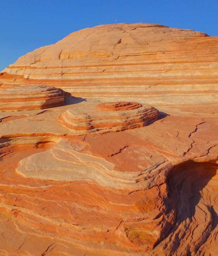 The next morning we rose early to drive the five mile White Domes Road to the Fire Wave/Seven Wonders Trail. After hiking a half mile enjoying the sweet fragrance of desert primrose, we discovered the firewave – colorful red and white swirls in the Aztec sandstone. The trail continued through a narrow slot canyon and ended with a steep and rugged uphill climb back to the parking lot.