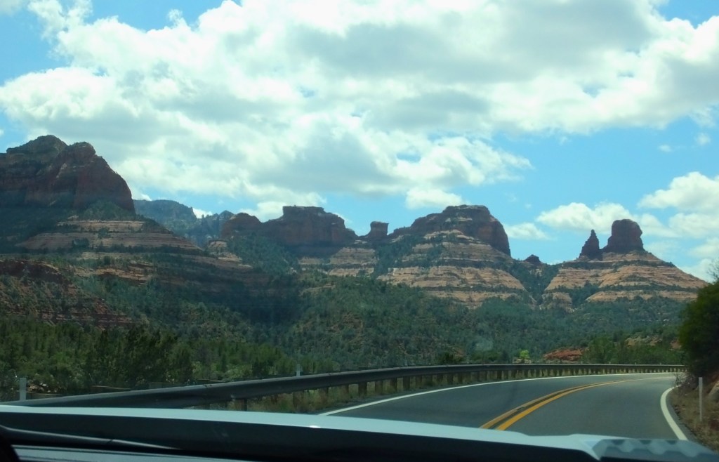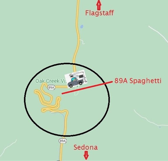The next morning, we drove south of Flagstaff, driving highway 89A to Cottonwood AZ. The highway descends narrow Oak Creek Canyon before reaching Sedona. The Google map of the route shows what can best be described as a plate of spaghetti!