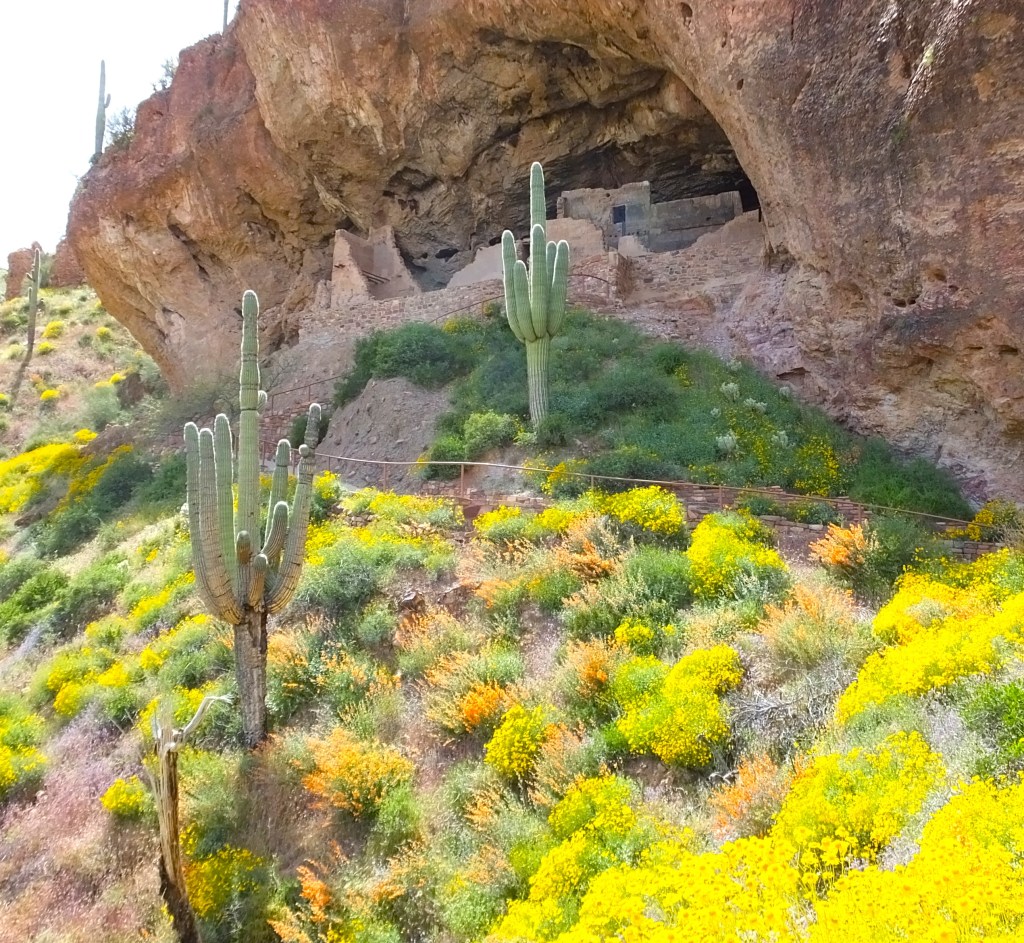 Tonto National Monument was along the detour, and we decided to stop to check things out. We hiked a steep half mile trail to a small cliff dwelling overlooking the rugged valley. Yellow, orange and purple desert flowers were at their peak.