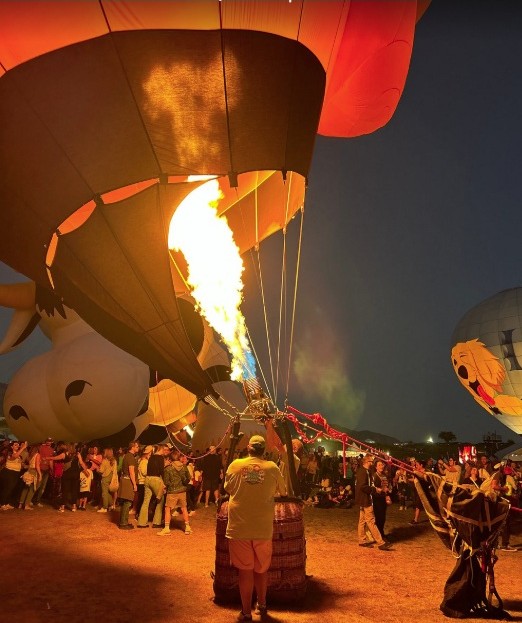 From just a few feet away, hear and feel rushing hot air as bustling crews use propane burners to fill balloons for launch.