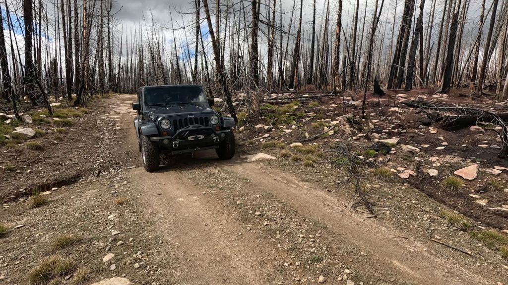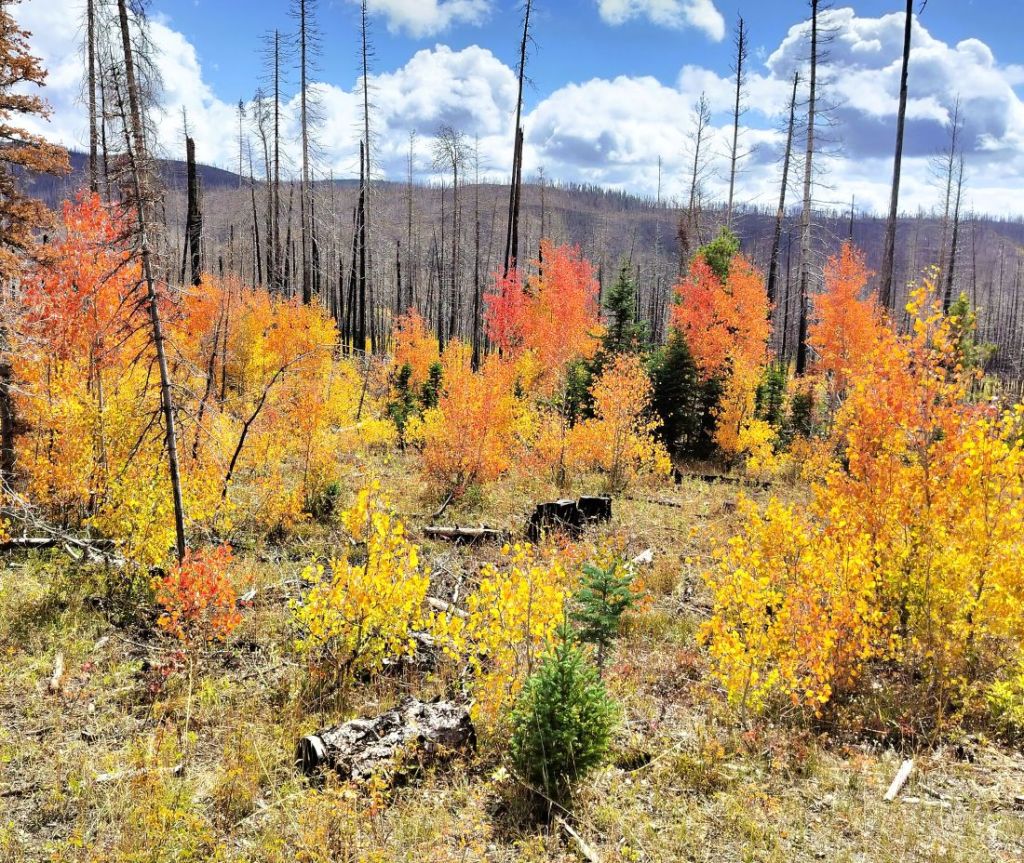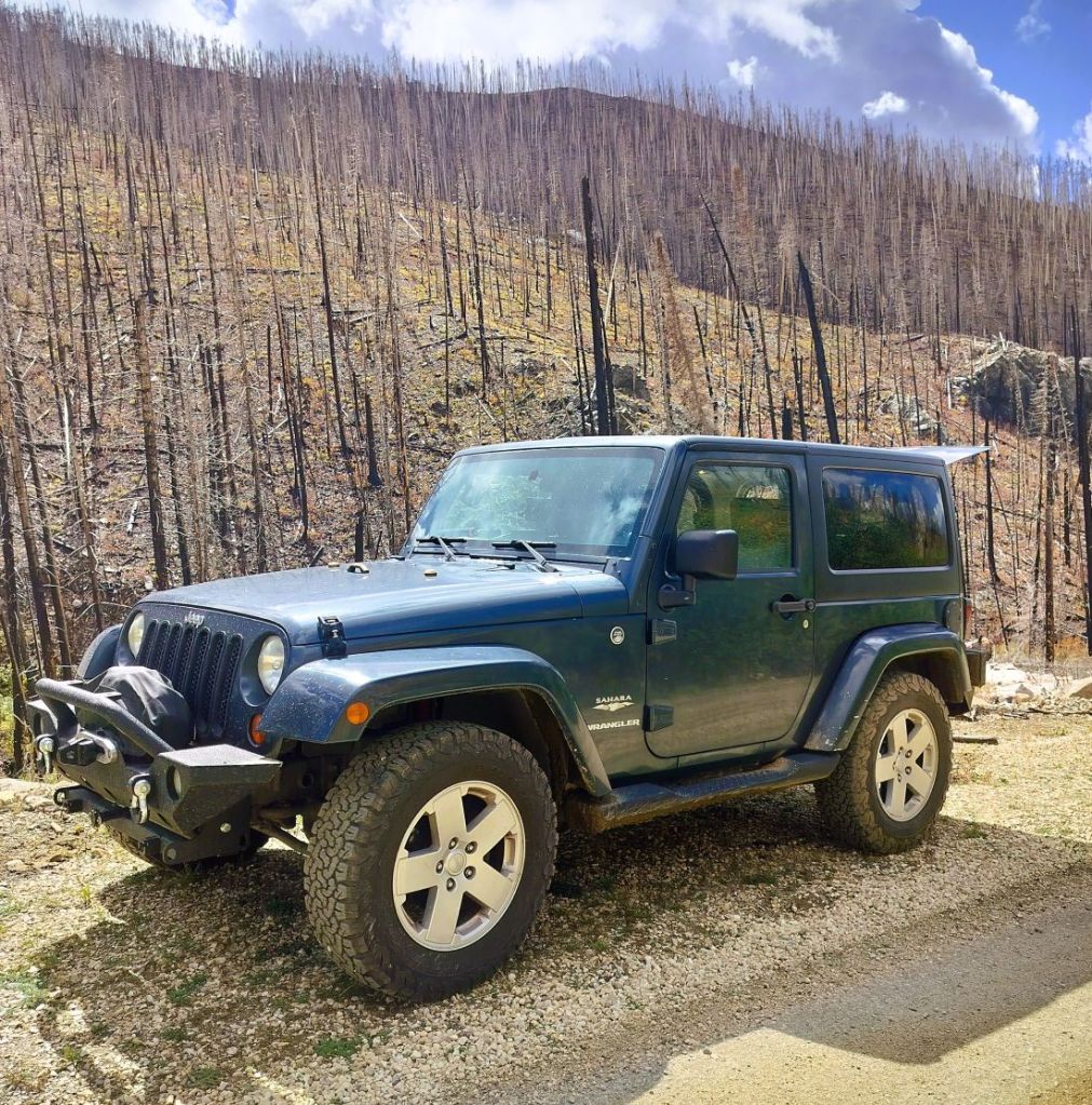 We decided to explore the area.  James skillfully drove his Jeep up narrow gravel roads as we ascended into Medicine Bow National Forest.  We drove through an area devastated by the East Troublesome Fire in October 2020.  Amidst the charred stalks of once robust pine and fir trees were low bushes and small aspen trees.  It will take many years for the forest to recreate itself.