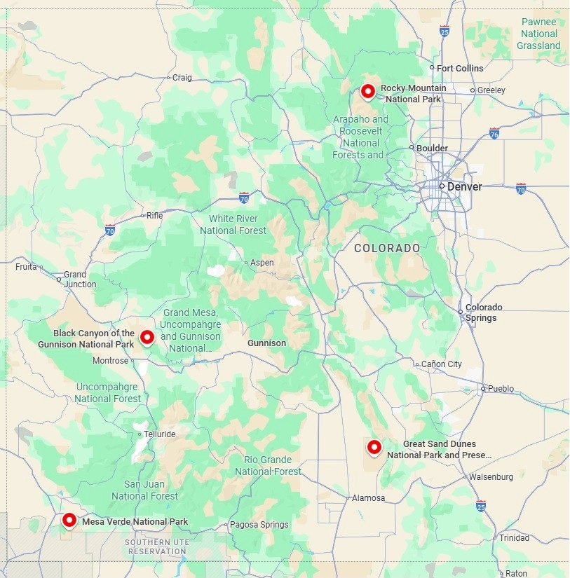 Colorado has its own bucket list combination of four national parks that are more diverse than those in Utah: Rocky Mountain, with incredible views at the top of the Rocky Mountains, Great Sand Dunes, with the tallest dunes in North America, Mesa Verde, the location of antient Puebloan cliff dwellings, and Black Canyon of the Gunnison, where the Gunnison River has carved a deep and narrow slit in the earth.
