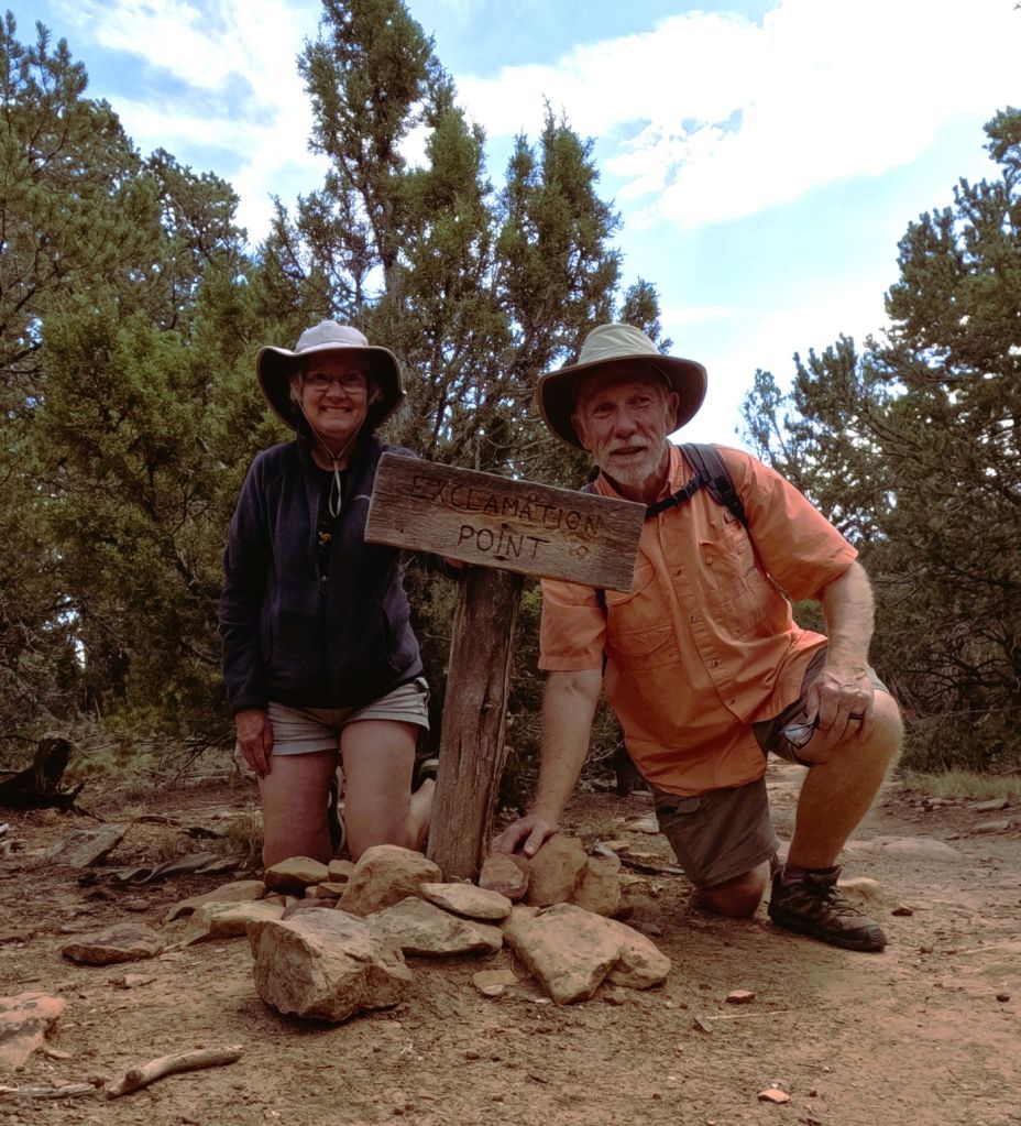 After posing for a selfie at a sign pointing us to Exclamation Point, we continued to a broad rock outcropping where the rugged canyon was visible from three sides. We found shade under a pinyon pine and enjoyed the view as we ate our backpack lunch.