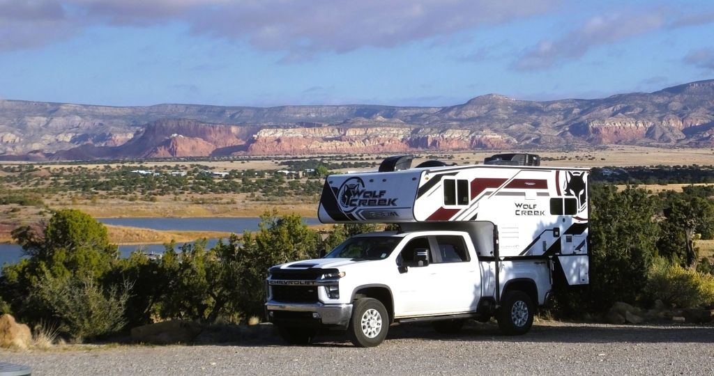 We camped several nights at a Corps of Engineers dam near Abiquiu, NM. Our campsite had a great view of the Abiquiu Reservoir and the red rock canyons and mountains in the distance.