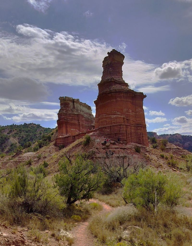Nicknamed “The Grand Canyon of Texas” both for its size and dramatic multicolored rock layers and steep mesa walls, Palo Duro is about 40 miles long, six miles wide (20 miles wide at places) and 800 feet deep.