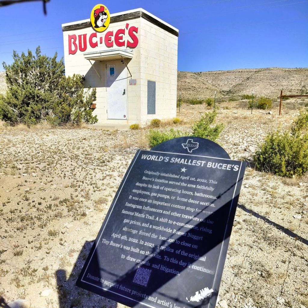 A sign indicated the tiny, single-door cinder block structure was the world’s smallest Buc-ees. It pokes fun at consumerism, similar to the faux, non-functional Prada store in Marfa, Texas, about 50 miles west on US 90.