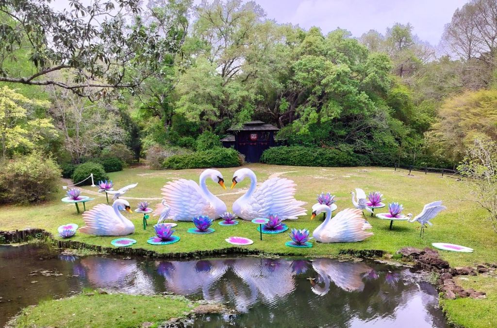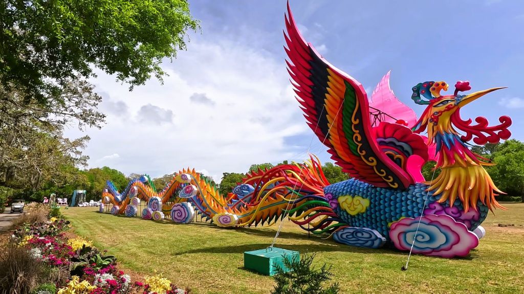 Although our timing wasn’t ideal – azaleas and camelias had recently finished blooming and hydrangeas, roses and other spring flowers had not yet started to bloom – we did enjoy colorful displays being setup for the Gulf Coast Chinese Lantern Festival later this spring.