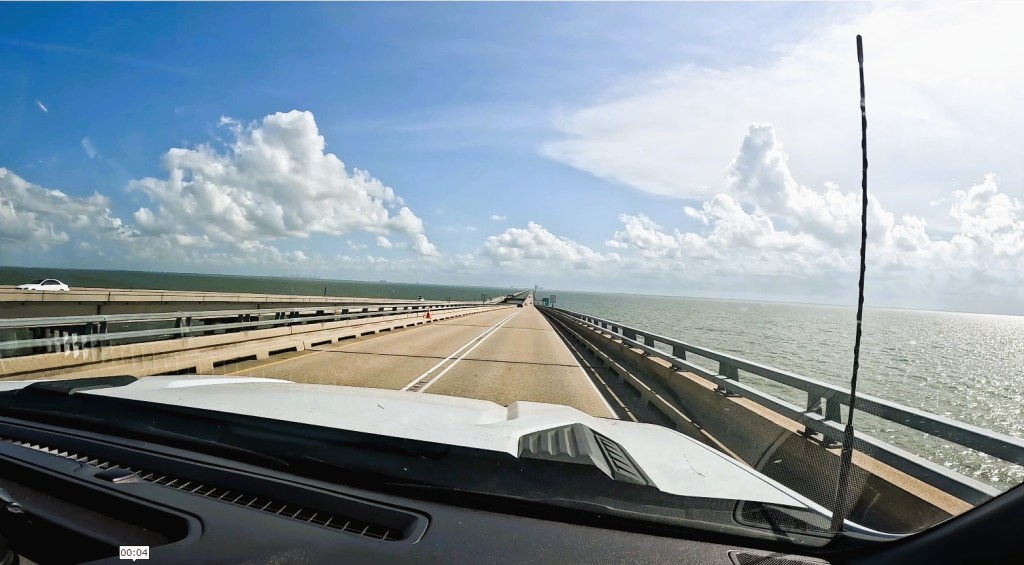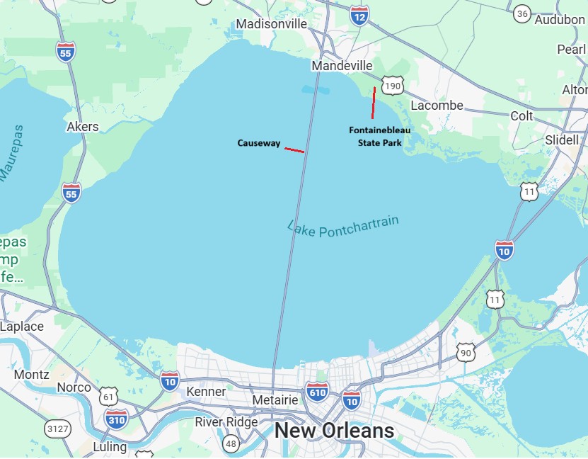 The lake above is bisected north-to-south by the Lake Pontchartrain Causeway, the longest continuous bridge over water in the world. Percy (sans Pap) carried us across the 23-mile-long bridge and back, a one-hour roundtrip. The New Orleans skyline was visible during part of the drive.