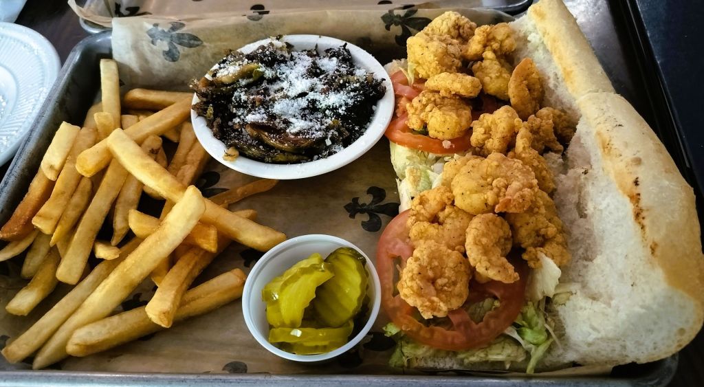 We rode to Mandeville, a quaint bedroom community north of New Orleans, where we ate lunch at Nan’s New Orleans Café. We shared a shrimp po-boy and sauteed Brussels sprouts. The crusty French bread sandwich was covered with fried shrimp and dressed with lettuce, sliced tomato, mayonnaise and dill pickles. The sprouts were tender, flavored with onion and bacon. As they say, anything tastes better with bacon, even Brussels sprouts!